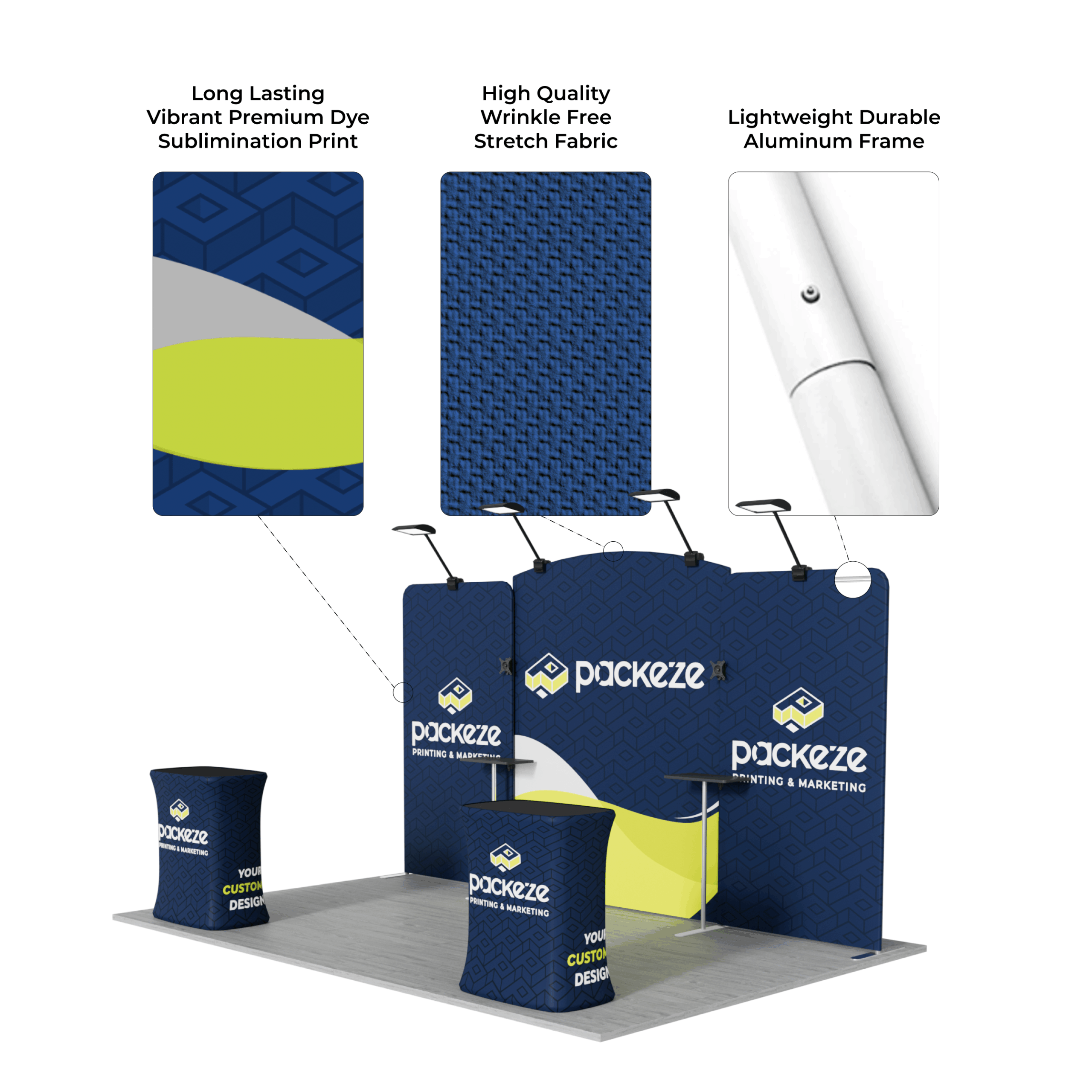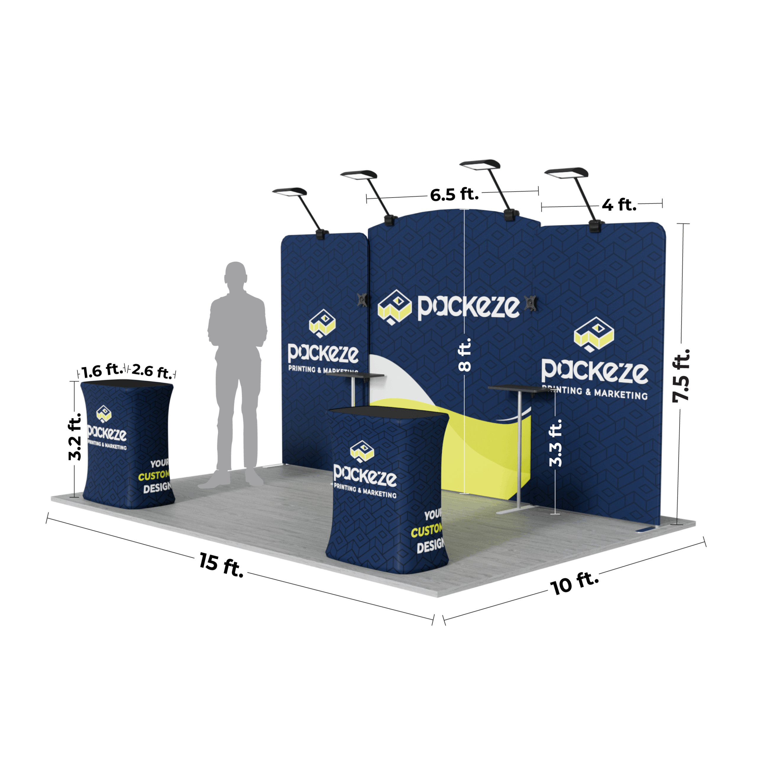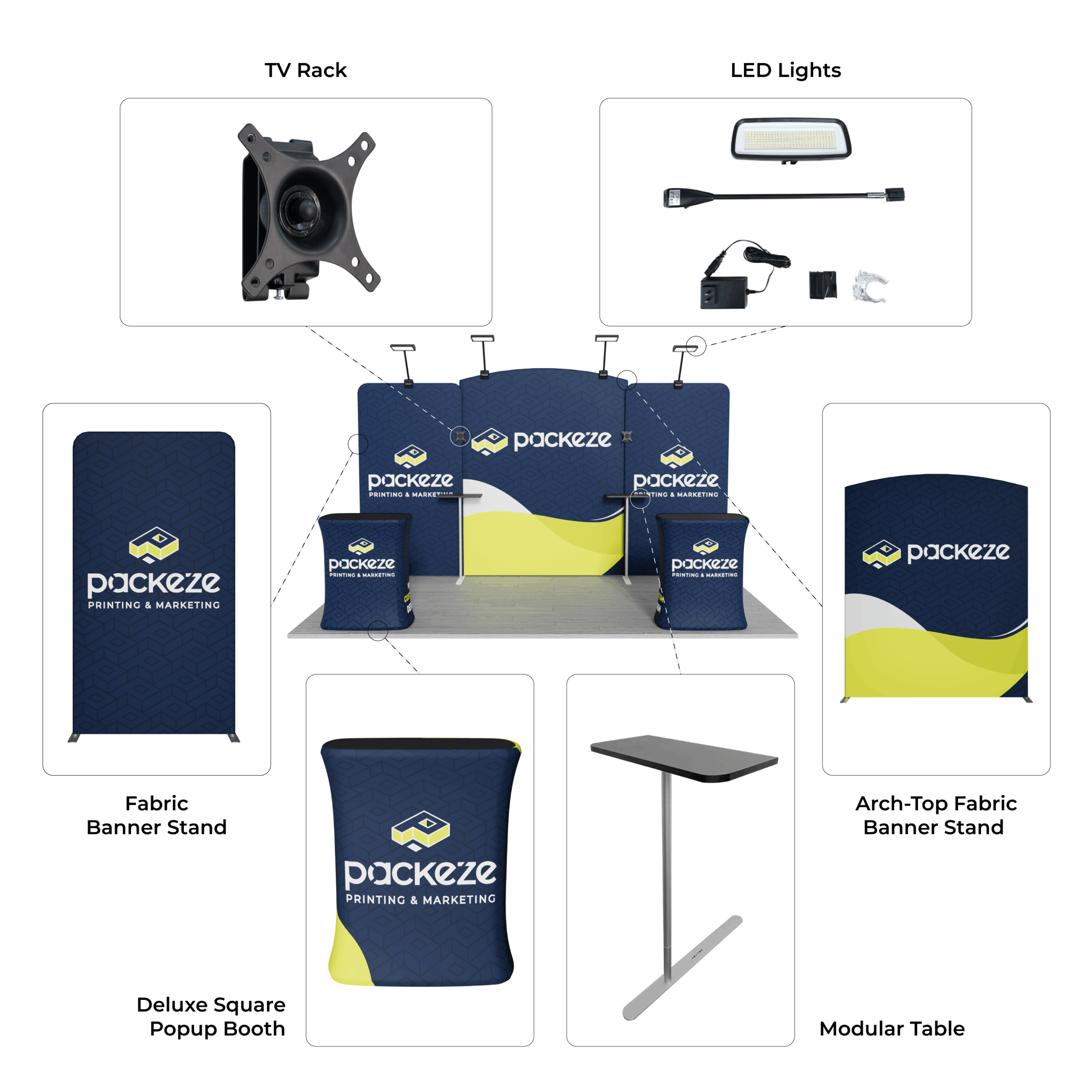 The C1 Package is a versatile 10x15ft trade show booth system designed for impactful, flexible, and high-visibility displays. Combining modern arch-top stands, modular counters, and brilliant LED lighting, this setup creates a professional environment that adapts to a variety of branding and presentation needs.